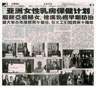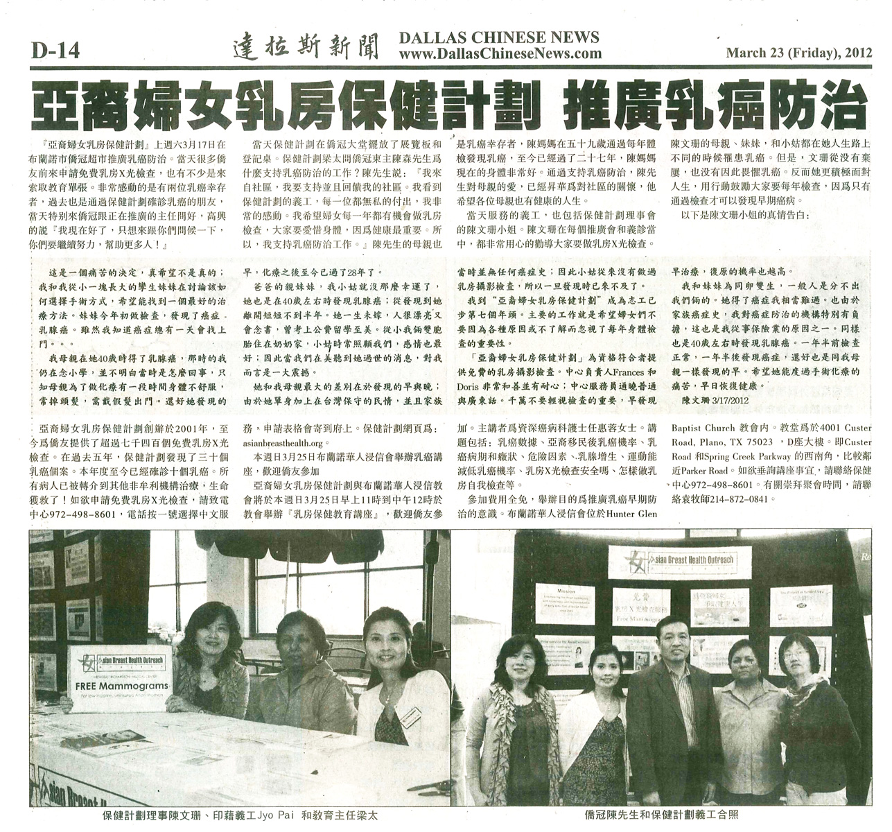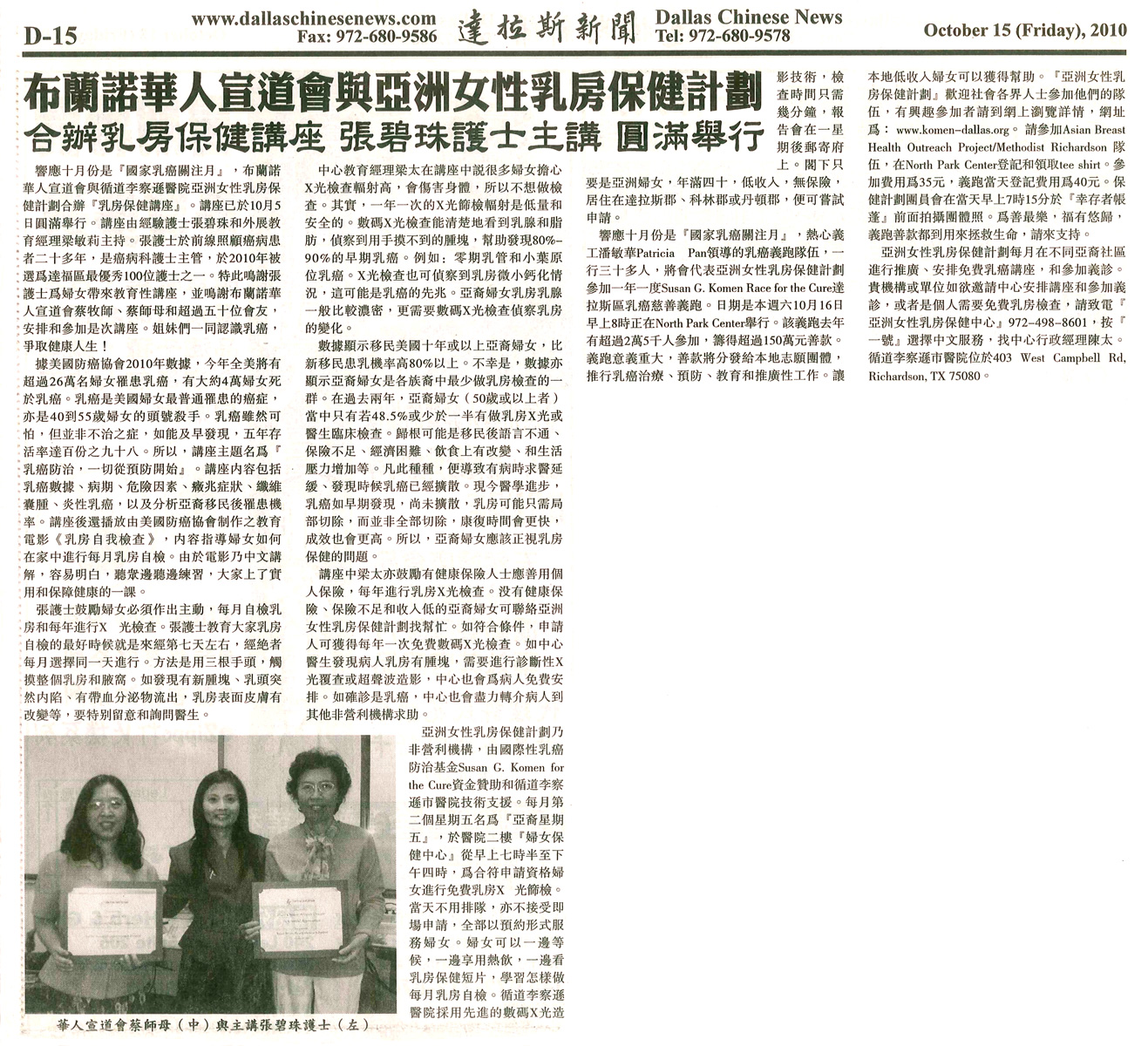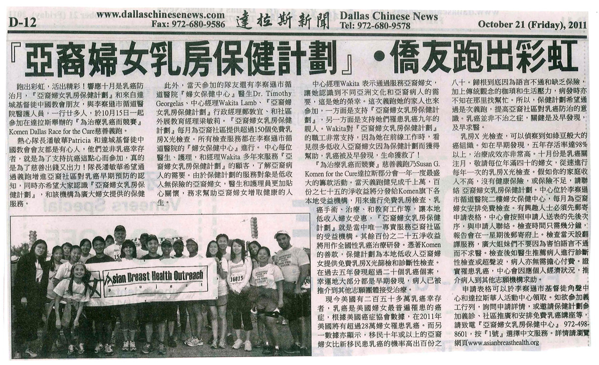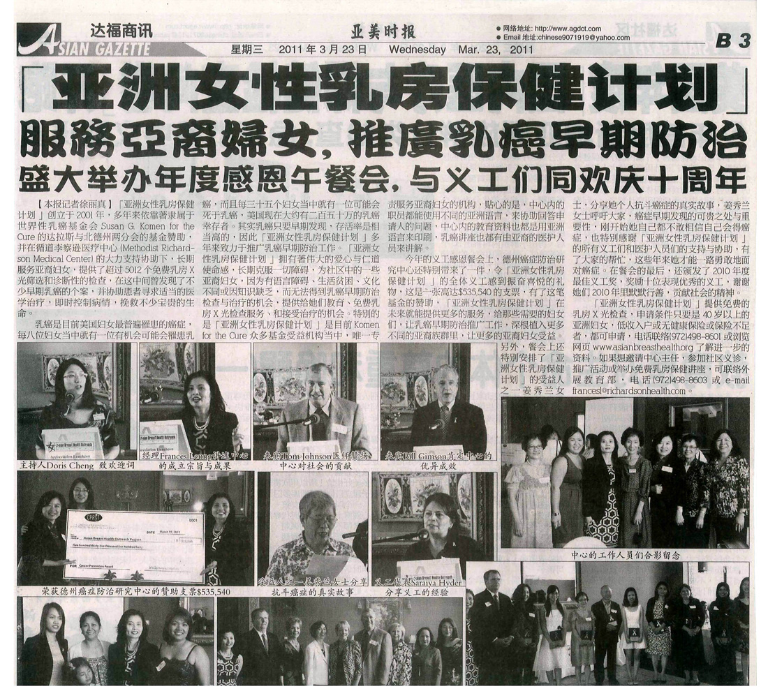 在110個被提名機構當中,『亞裔婦女乳房保健計劃』榮獲美國『達拉斯商業日誌』Dallas Business Journal選舉為2010年度『醫護英雄』。該獎項是表揚對北德州醫療和醫護服務有貢獻的機構。