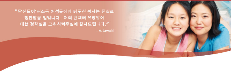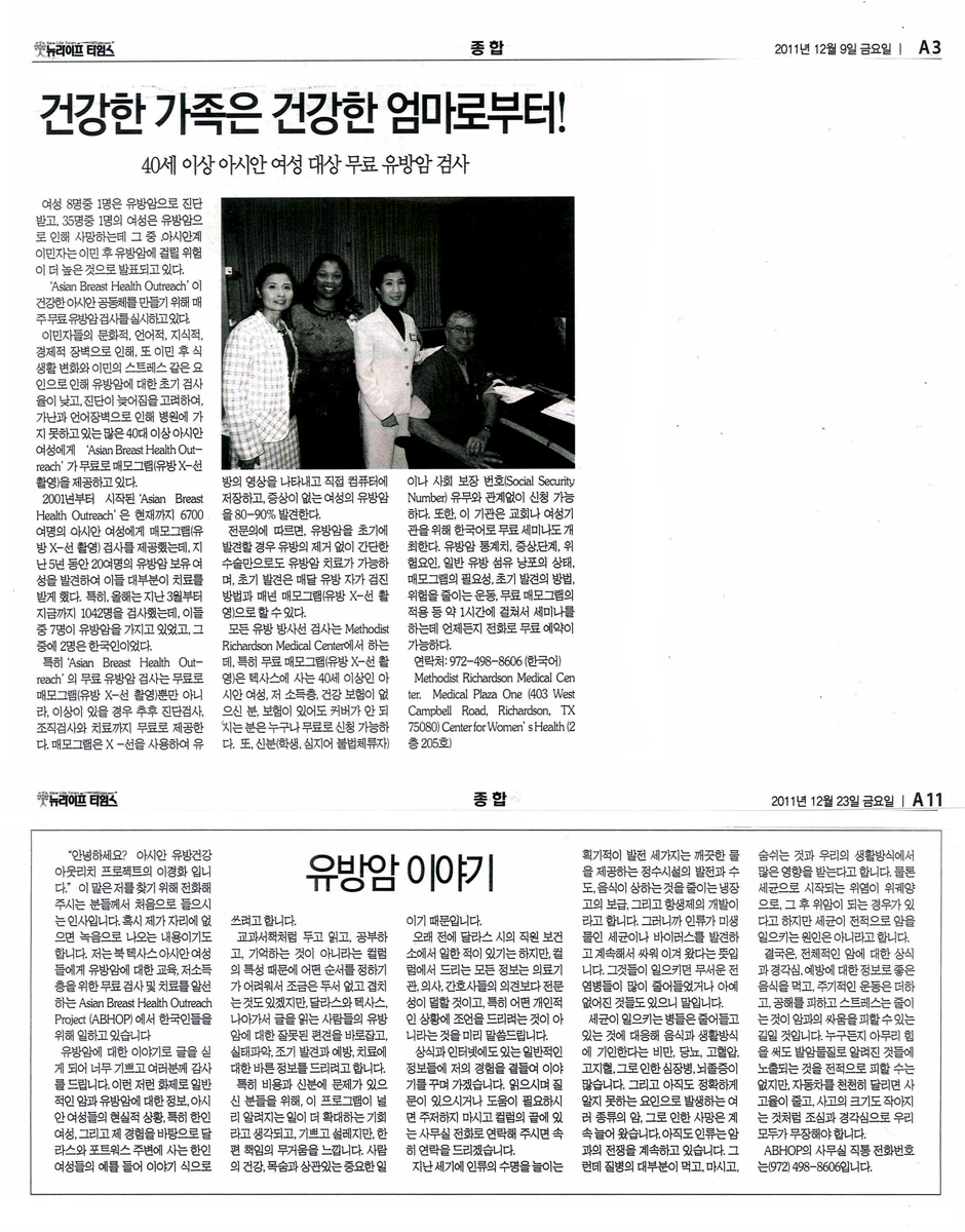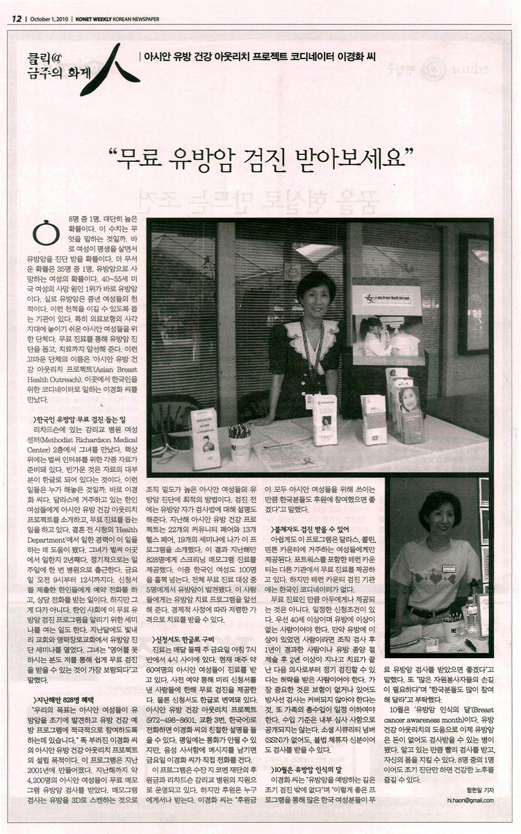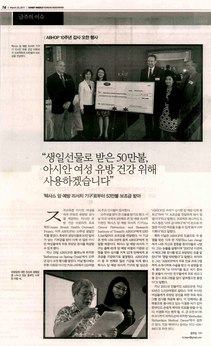 2009년에 아시안 유방 건강 아웃리치 프로젝트는 미국 암 협회로부터 혜택을 받지 못하는 소수 민족에게 우수한 봉사를 제공한 사실을 인정받아 High Plains Division인 해롤드 P. 프리먼 봉사상을 받았습니다. 전국에서 뽑힌 네 단체 중 텍사스에서는 유일한 단체로서 이 표창으로 스태프 및 자원 봉사자들이 계속해서 문화와 언어 장벽을 허물고, 모든 아시안 여성들에게 유방보호의 중요성을 알리고 유방암으로 사망하는 여성을 줄이도록 격려를 받았습니다. 시상식에서 게리 슬레이글 리차드슨시장은 ABHOP를 시의 선언으로 소개했습니다.