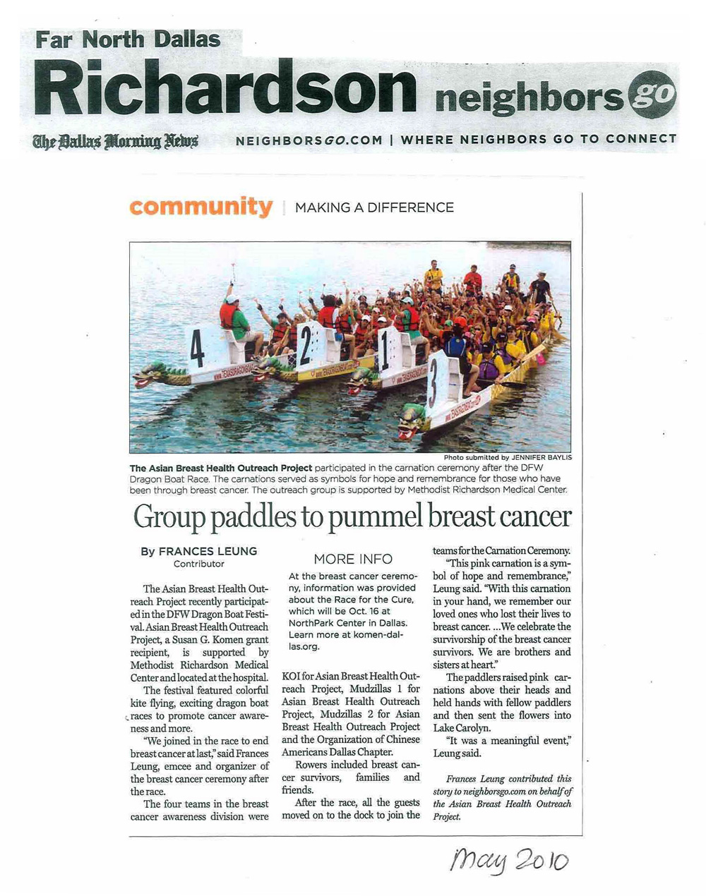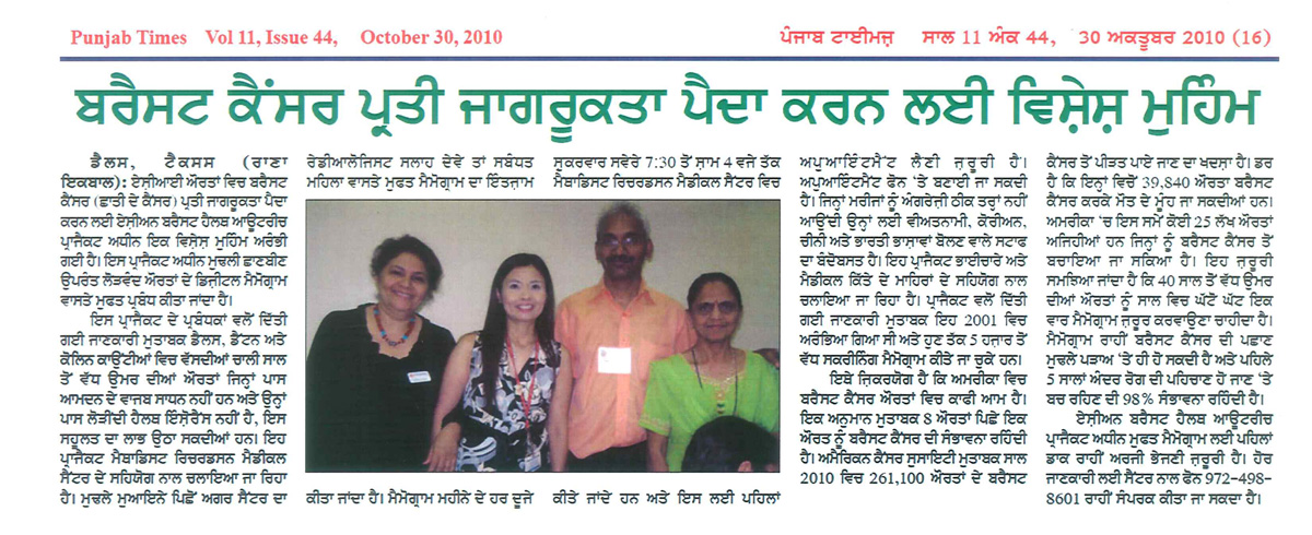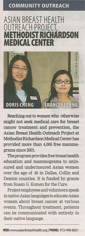 Asian Breast Health Outreach Project has been chosen as a 2010 Health Care Hero by the Dallas Business Journal. ABHOP was selected among more than 110 nominations. The designation recognizes the contributions made towards improving health and health care services in North Texas.