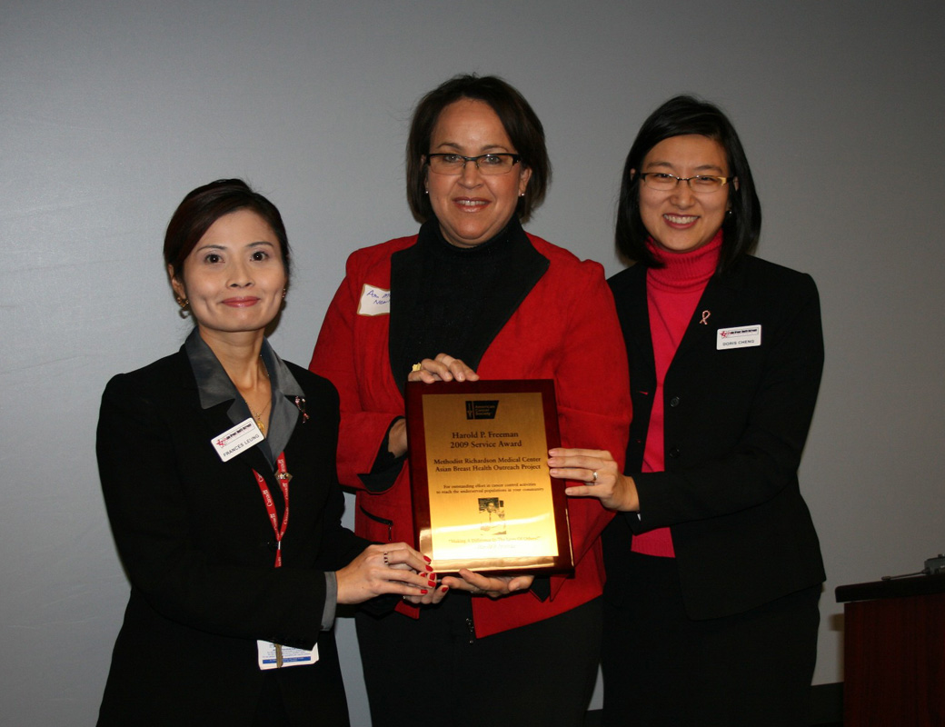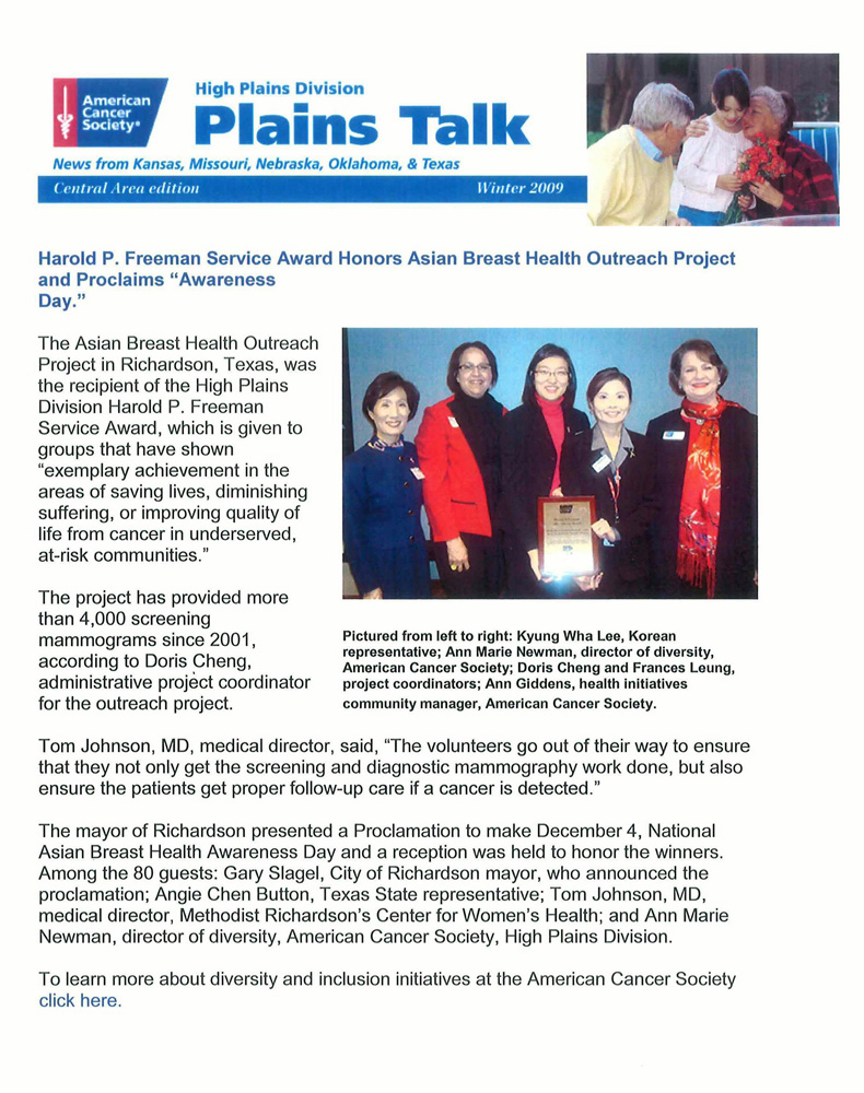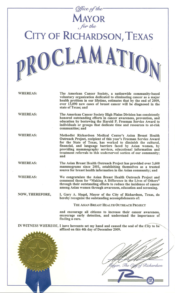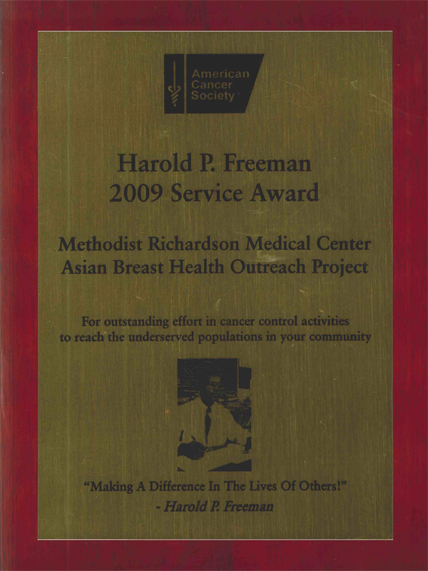 In 2009, Asian Breast Health Outreach Project was recognized for the outstanding services provided to the underserved minority populations with the American Cancer Society, High Plains Division, Harold P. Freeman Service Award. One of only 4 nationally selected and only one in Texas, the recognition encourages ABHOP, the staff, and our volunteers, to continue to break the cultural and language barriers and spread the importance of breast care to all Asian populations so that fewer women die from breast cancer. At the award ceremony, the Mayor of Richardson Gary Slagel also presented ABHOP with a City Proclamation.