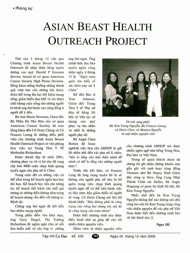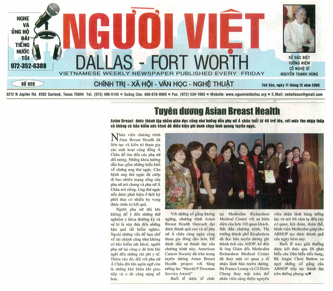 Trong năm 2009, Hội Asian Breast Health Outreach Project đã được sự công nhận của American Cancer Society, High Plains Division, Harold P. Freeman Service Award là một trong những hội đứng đầu về dịch vụ giúp đỡ các chủng tộc thiểu số. Sau khi thắng giải dịch vụ của toàn quốc thì toàn thể nhân viên và tình nguyện viên đã tăng cường nổ lực để cố gắng hơn để vượt qua những khó khăn như ngôn ngử hoặc kiến thức và văn hóa để giúp nâng cao việc đề cao cảnh giác về chứng bệnh ung thư ngực trong vòng người phụ nữ Á Châu. Tại buổi lễ trao giải, thị trưởng của thành phố Richardson là ông Gary Slagel đã phát tuyên ngôn cho Hội Asian Breast Health Outreach Project.