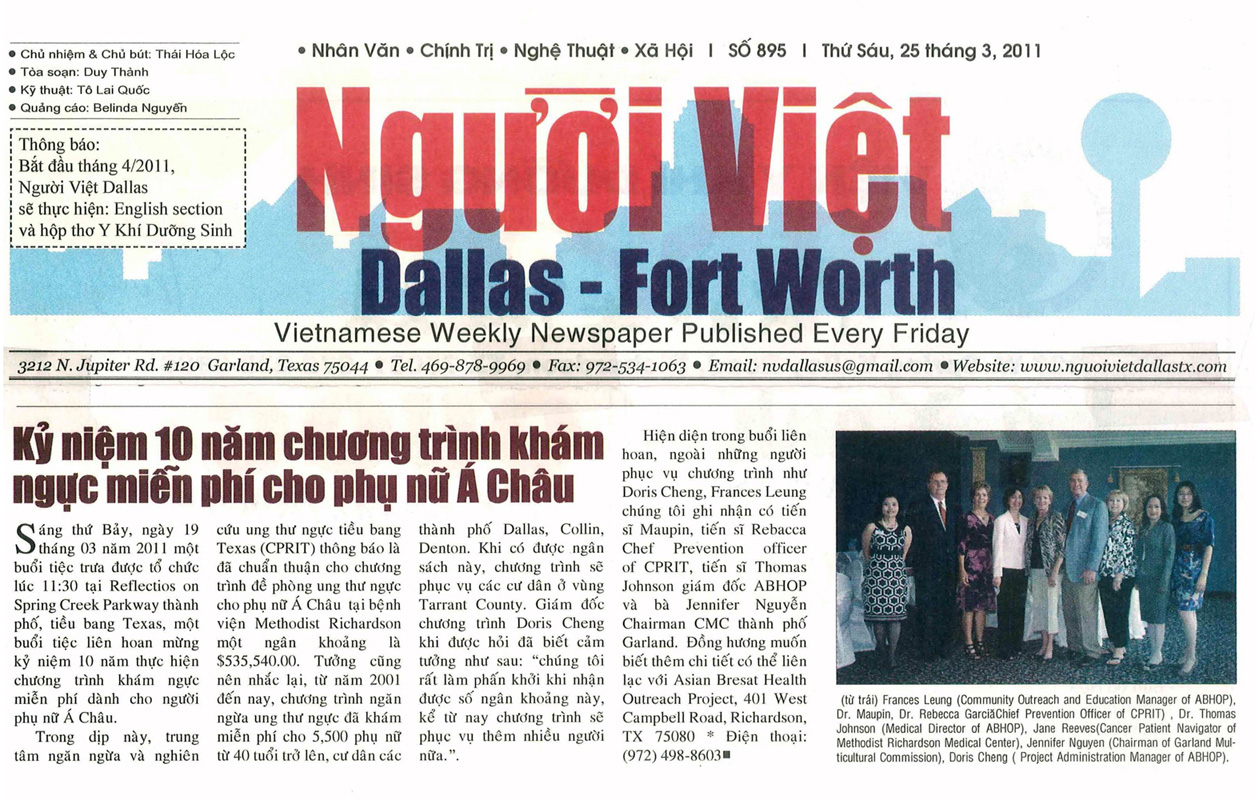Năm 2010, Hội Asian Breast Health Outreach Project đã được Dallas Business Journal chọn là “Anh Hùng Bảo An Sức Khỏe” (Health Care Hero). ABHOP là 1 trong 110 những đề cử được bình chọn. Ban giám định đã công nhận sự đóng góp về sức khỏe và việc cải thiện các dịch vụ chăm sóc sức khỏe ở Vùng Bắc Texas.